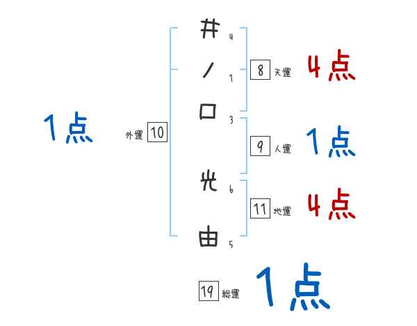 天運![]() | 井ノ口光由さんの天運は8画の4つ星!勤勉家。根気強く努力し成功する。忍耐力がある。 家系が持つ宿命的な運勢を表します。祖先から受け継いだ苗字ですので自分の力が及びません。家柄を象徴します。 |