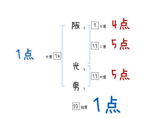 天運![]() | 阪光男さんの天運は7画の4つ星!強い意志や信念を持ち独立心が強い。自立する。 家系が持つ宿命的な運勢を表します。祖先から受け継いだ苗字ですので自分の力が及びません。家柄を象徴します。 |