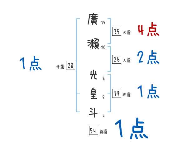 天運![]() | 廣瀨光皇斗さんの天運は35画の4つ星!温厚な性格で感受性が高い。穏和な性格で人望が厚い。 家系が持つ宿命的な運勢を表します。祖先から受け継いだ苗字ですので自分の力が及びません。家柄を象徴します。 |
