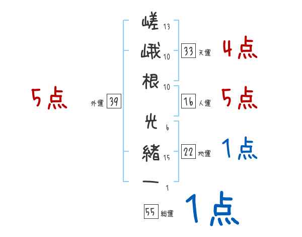 人運![]() | 嵯峨根光緒一さんの人運は16画の5つ星!人望が厚く大きく発展する。逆転成功が見える。 性格や才能などを表す2番目に重要な運勢です。人間関係や協調性、社会的な成功に影響します。主に20歳から50歳ぐらいまでの中年期の運勢を表します。 |