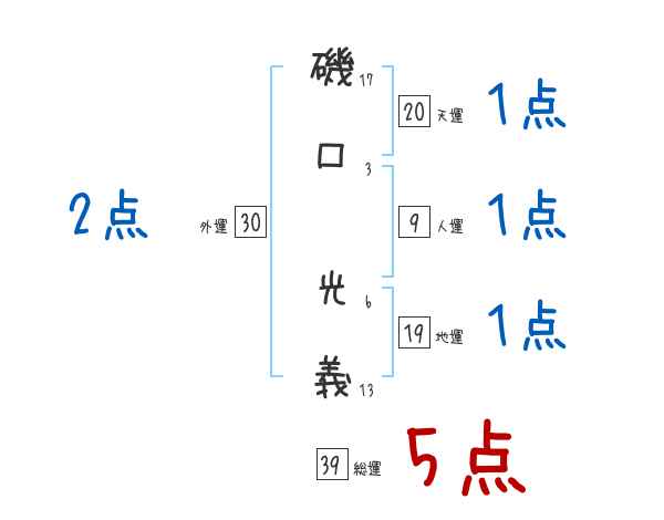 総運![]() | 磯口光義さんの総運は39画の5つ星!社交性に優れ人望が厚い。人の上に立ち成功する。 あなたの人生を表す1番重要な運勢です。生涯を通じて影響する総合運となり、主に50歳以降の晩年期に影響を及ぼします。 |