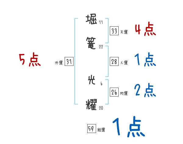 天運![]() | 堀篭光耀さんの天運は33画の4つ星!権力志向でプライドが高い。勇気があり運を切り開き成功する。 家系が持つ宿命的な運勢を表します。祖先から受け継いだ苗字ですので自分の力が及びません。家柄を象徴します。 |