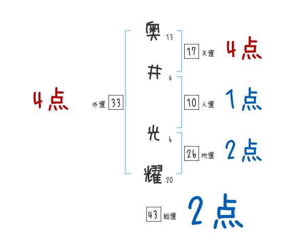 外運![]() | 奥井光耀さんの外運は33画の4つ星!権力志向でプライドが高い。勇気があり運を切り開き成功する。 生活面を象徴する運勢です。外部から受ける影響力を表し、結婚運、家庭運や職場、環境への順応性を表します。 |