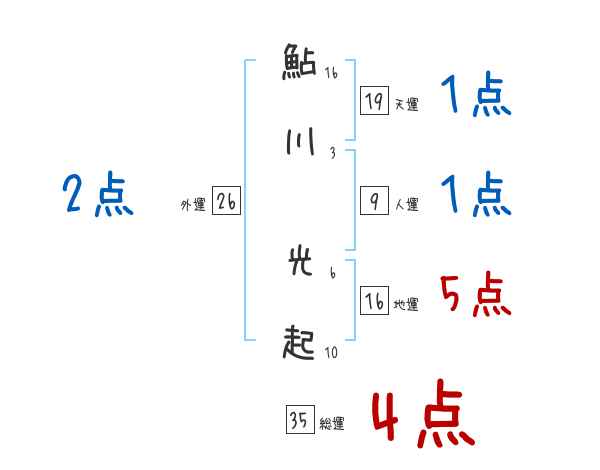 外運![]() | 鮎川光起さんの外運は26画の2つ星!波瀾万丈かも。信頼できる人を大事にしましょう。 生活面を象徴する運勢です。外部から受ける影響力を表し、結婚運、家庭運や職場、環境への順応性を表します。 |