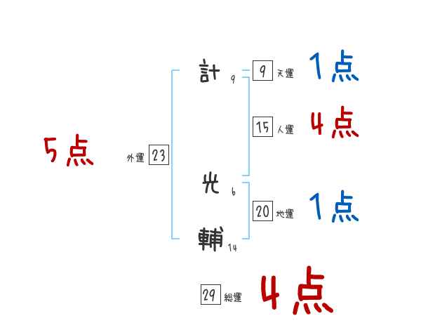 天運![]() | 計光輔さんの天運は9画の1つ星!消極的で才能を発揮することが苦手なことも。周りの意見に耳を傾けましょう。 家系が持つ宿命的な運勢を表します。祖先から受け継いだ苗字ですので自分の力が及びません。家柄を象徴します。 |