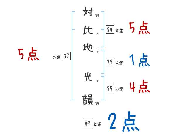 外運![]() | 対比地光韻さんの外運は37画の5つ星!努力家で順応性に優れる。現実的な考え方ができ忠実に物事をこなす。 生活面を象徴する運勢です。外部から受ける影響力を表し、結婚運、家庭運や職場、環境への順応性を表します。 |