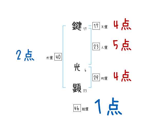 人運![]() | 鍵光顕さんの人運は23画の5つ星!想像力に優れ活力がある。一代で成功し名誉を手に入れる。 性格や才能などを表す2番目に重要な運勢です。人間関係や協調性、社会的な成功に影響します。主に20歳から50歳ぐらいまでの中年期の運勢を表します。 |