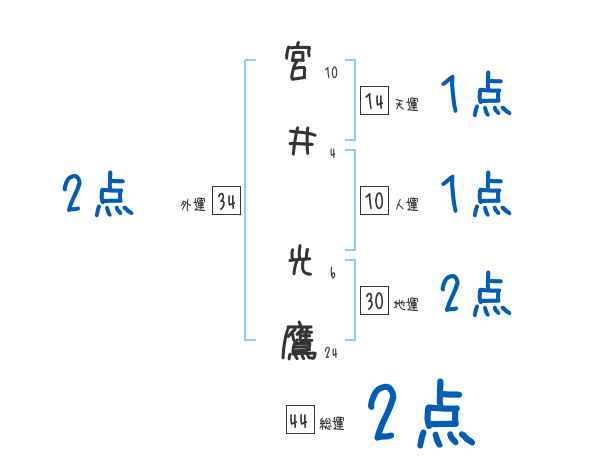 総運![]() | 宮井光鷹さんの総運は44画の2つ星!誠実で慎重な性格。物事を考えすぎないように注意しましょう。 あなたの人生を表す1番重要な運勢です。生涯を通じて影響する総合運となり、主に50歳以降の晩年期に影響を及ぼします。 |
