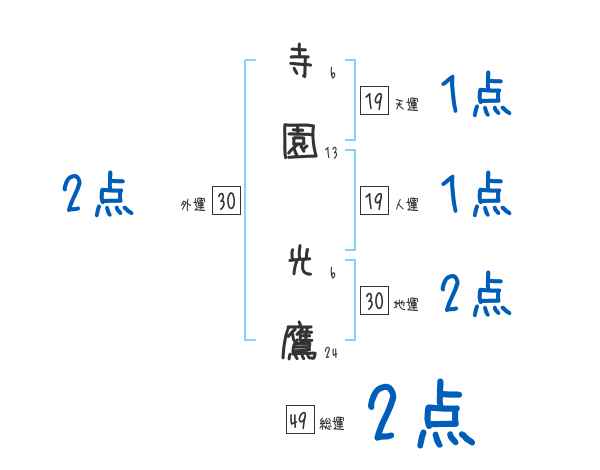 外運![]() | 寺園光鷹さんの外運は30画の2つ星!浮き沈みの激しさに注意しましょう。 生活面を象徴する運勢です。外部から受ける影響力を表し、結婚運、家庭運や職場、環境への順応性を表します。 |