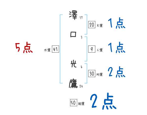 総運![]() | 澤口光鷹さんの総運は50画の2つ星!浮き沈みが激しく不安定。しりすぼみに衰退しやすいので注意しましょう。 あなたの人生を表す1番重要な運勢です。生涯を通じて影響する総合運となり、主に50歳以降の晩年期に影響を及ぼします。 |