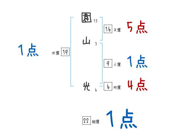 総運![]() | 園山光さんの総運は22画の1つ星!努力することが苦手ないっぽう手先が器用。芸術性にも優れる。 あなたの人生を表す1番重要な運勢です。生涯を通じて影響する総合運となり、主に50歳以降の晩年期に影響を及ぼします。 |