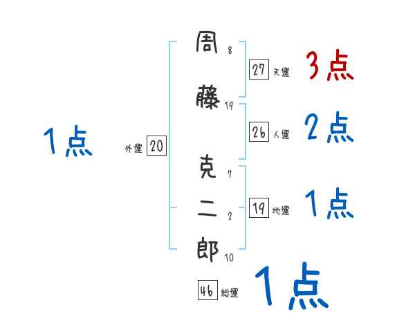 人運![]() | 周藤克二郎さんの人運は26画の2つ星!波瀾万丈かも。信頼できる人を大事にしましょう。 性格や才能などを表す2番目に重要な運勢です。人間関係や協調性、社会的な成功に影響します。主に20歳から50歳ぐらいまでの中年期の運勢を表します。 |