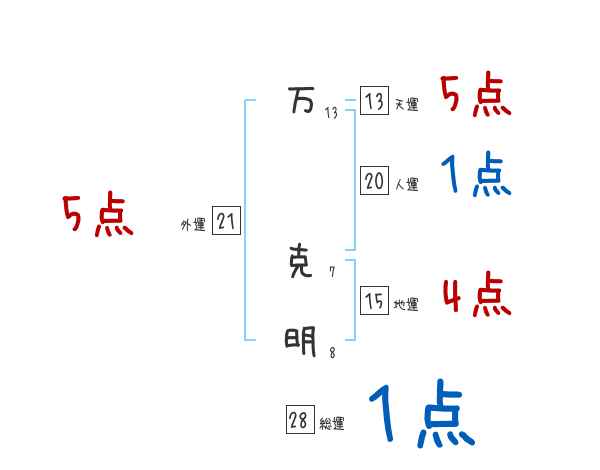 天運![]() | 万克明さんの天運は13画の5つ星!才能に恵まれ人気がある。名声を手に入れる。円満な人生。 家系が持つ宿命的な運勢を表します。祖先から受け継いだ苗字ですので自分の力が及びません。家柄を象徴します。 |