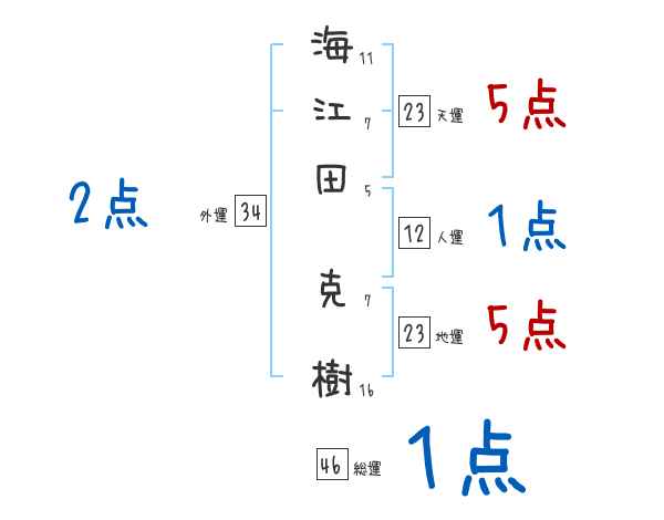 天運![]() | 海江田克樹さんの天運は23画の5つ星!想像力に優れ活力がある。一代で成功し名誉を手に入れる。 家系が持つ宿命的な運勢を表します。祖先から受け継いだ苗字ですので自分の力が及びません。家柄を象徴します。 |