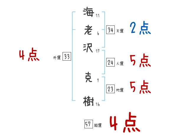 外運![]() | 海老沢克樹さんの外運は33画の4つ星!権力志向でプライドが高い。勇気があり運を切り開き成功する。 生活面を象徴する運勢です。外部から受ける影響力を表し、結婚運、家庭運や職場、環境への順応性を表します。 |