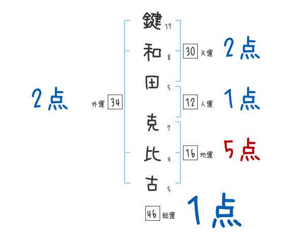 天運![]() | 鍵和田克比古さんの天運は30画の2つ星!浮き沈みの激しさに注意しましょう。 家系が持つ宿命的な運勢を表します。祖先から受け継いだ苗字ですので自分の力が及びません。家柄を象徴します。 |