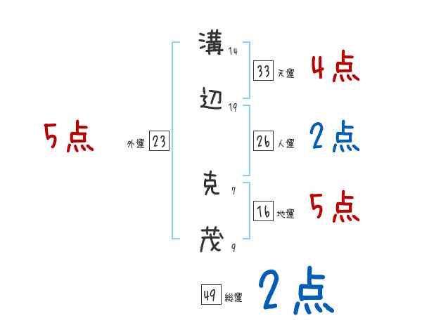 天運![]() | 溝辺克茂さんの天運は33画の4つ星!権力志向でプライドが高い。勇気があり運を切り開き成功する。 家系が持つ宿命的な運勢を表します。祖先から受け継いだ苗字ですので自分の力が及びません。家柄を象徴します。 |