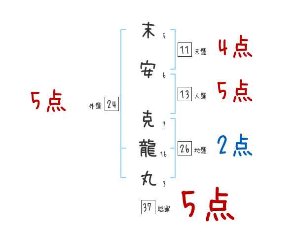 外運![]() | 末安克龍丸さんの外運は24画の5つ星!家庭運が良く順調な人生。金運にも恵まれる。 生活面を象徴する運勢です。外部から受ける影響力を表し、結婚運、家庭運や職場、環境への順応性を表します。 |