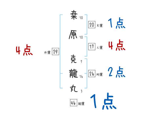 外運![]() | 桒原克龍丸さんの外運は29画の4つ星!完全主義で才能がある。厳格な心の持ち主。 生活面を象徴する運勢です。外部から受ける影響力を表し、結婚運、家庭運や職場、環境への順応性を表します。 |