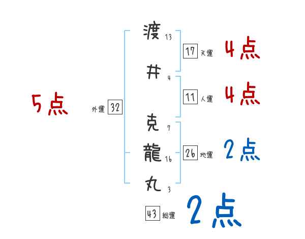 外運![]() | 渡井克龍丸さんの外運は32画の5つ星!柔軟性があり成功する。チャンスが多く金運が良い。 生活面を象徴する運勢です。外部から受ける影響力を表し、結婚運、家庭運や職場、環境への順応性を表します。 |