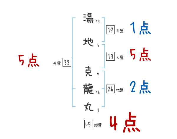 外運![]() | 湯地克龍丸さんの外運は32画の5つ星!柔軟性があり成功する。チャンスが多く金運が良い。 生活面を象徴する運勢です。外部から受ける影響力を表し、結婚運、家庭運や職場、環境への順応性を表します。 |