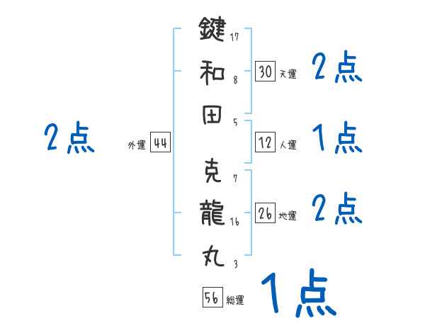 総運![]() | 鍵和田克龍丸さんの総運は56画の1つ星!消極的で無気力になりがち。誠実な気持ちが必要でしょう。 あなたの人生を表す1番重要な運勢です。生涯を通じて影響する総合運となり、主に50歳以降の晩年期に影響を及ぼします。 |