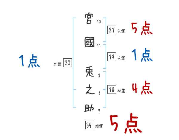 天運![]() | 宮國兎之助さんの天運は21画の5つ星!統率力がある。独立し成功する。名誉を手に入れる。 家系が持つ宿命的な運勢を表します。祖先から受け継いだ苗字ですので自分の力が及びません。家柄を象徴します。 |