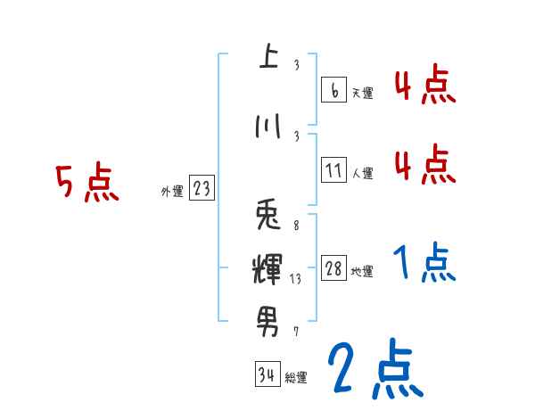 外運![]() | 上川兎輝男さんの外運は23画の5つ星!想像力に優れ活力がある。一代で成功し名誉を手に入れる。 生活面を象徴する運勢です。外部から受ける影響力を表し、結婚運、家庭運や職場、環境への順応性を表します。 |