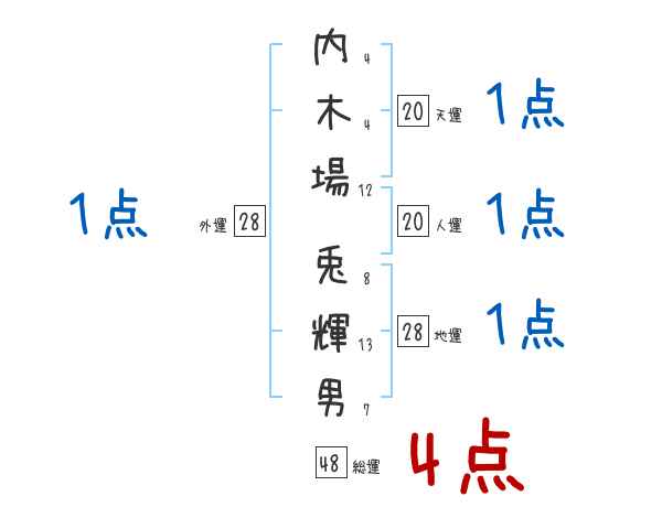 外運![]() | 内木場兎輝男さんの外運は28画の1つ星!家庭環境に注意。スポーツで活躍できる能力があるかも。 生活面を象徴する運勢です。外部から受ける影響力を表し、結婚運、家庭運や職場、環境への順応性を表します。 |