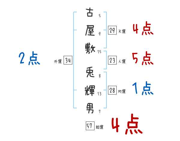 天運![]() | 古屋敷兎輝男さんの天運は29画の4つ星!完全主義で才能がある。厳格な心の持ち主。 家系が持つ宿命的な運勢を表します。祖先から受け継いだ苗字ですので自分の力が及びません。家柄を象徴します。 |
