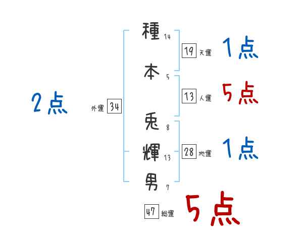 総運![]() | 種本兎輝男さんの総運は47画の5つ星!実力が開花し発展する円満な人生。財に恵まれる。 あなたの人生を表す1番重要な運勢です。生涯を通じて影響する総合運となり、主に50歳以降の晩年期に影響を及ぼします。 |
