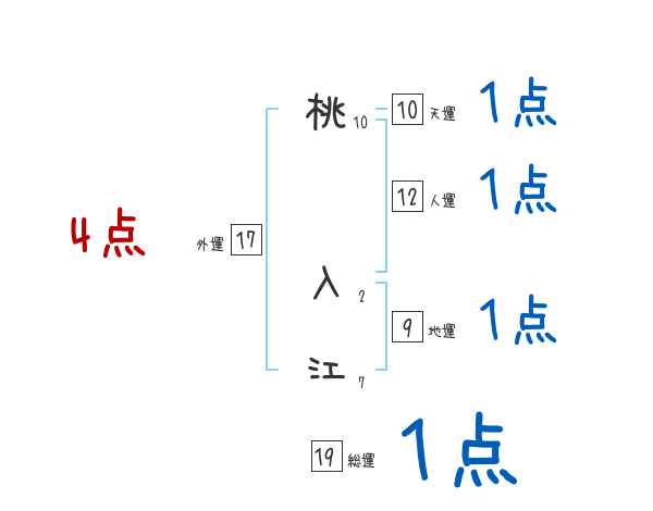 天運![]() | 桃入江さんの天運は10画の1つ星!不安を感じやすい傾向。ストレスを抱えないように注意しましょう。 家系が持つ宿命的な運勢を表します。祖先から受け継いだ苗字ですので自分の力が及びません。家柄を象徴します。 |