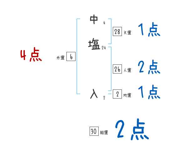 総運![]() | 中塩入さんの総運は30画の2つ星!浮き沈みの激しさに注意しましょう。 あなたの人生を表す1番重要な運勢です。生涯を通じて影響する総合運となり、主に50歳以降の晩年期に影響を及ぼします。 |