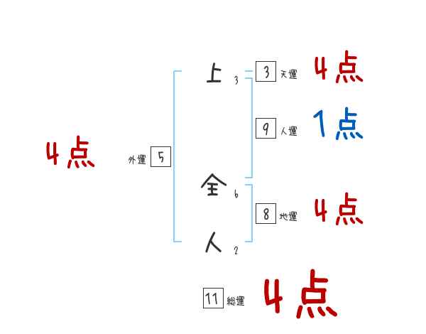 天運![]() | 上全人さんの天運は3画の4つ星!活動的で才能に恵まれ、多くの信頼を得る。希望に満ち成長する。 家系が持つ宿命的な運勢を表します。祖先から受け継いだ苗字ですので自分の力が及びません。家柄を象徴します。 |