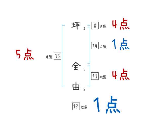 外運![]() | 坪全由さんの外運は13画の5つ星!才能に恵まれ人気がある。名声を手に入れる。円満な人生。 生活面を象徴する運勢です。外部から受ける影響力を表し、結婚運、家庭運や職場、環境への順応性を表します。 |