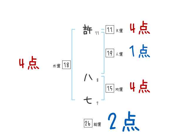 天運![]() | 許八七さんの天運は11画の4つ星!着実に富や地位を得る幸運な人生。 家系が持つ宿命的な運勢を表します。祖先から受け継いだ苗字ですので自分の力が及びません。家柄を象徴します。 |