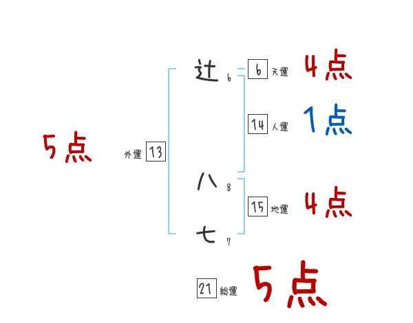 天運![]() | 辻八七さんの天運は6画の4つ星!慎重な努力家で信頼を得る。誠実な精神で向上心に優れる。 家系が持つ宿命的な運勢を表します。祖先から受け継いだ苗字ですので自分の力が及びません。家柄を象徴します。 |