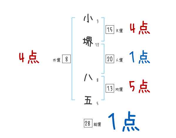 総運![]() | 小堺八五さんの総運は28画の1つ星!家庭環境に注意。スポーツで活躍できる能力があるかも。 あなたの人生を表す1番重要な運勢です。生涯を通じて影響する総合運となり、主に50歳以降の晩年期に影響を及ぼします。 |
