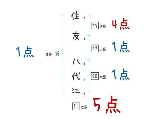 天運![]() | 住友八代江さんの天運は11画の4つ星!着実に富や地位を得る幸運な人生。 家系が持つ宿命的な運勢を表します。祖先から受け継いだ苗字ですので自分の力が及びません。家柄を象徴します。 |