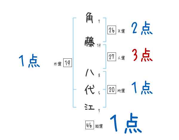 天運![]() | 角藤八代江さんの天運は26画の2つ星!波瀾万丈かも。信頼できる人を大事にしましょう。 家系が持つ宿命的な運勢を表します。祖先から受け継いだ苗字ですので自分の力が及びません。家柄を象徴します。 |