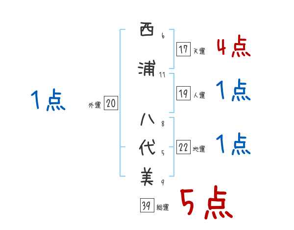 総運![]() | 西浦八代美さんの総運は39画の5つ星!社交性に優れ人望が厚い。人の上に立ち成功する。 あなたの人生を表す1番重要な運勢です。生涯を通じて影響する総合運となり、主に50歳以降の晩年期に影響を及ぼします。 |