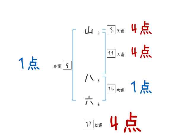 天運![]() | 山八六さんの天運は3画の4つ星!活動的で才能に恵まれ、多くの信頼を得る。希望に満ち成長する。 家系が持つ宿命的な運勢を表します。祖先から受け継いだ苗字ですので自分の力が及びません。家柄を象徴します。 |