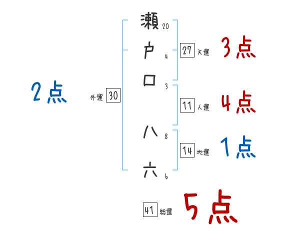天運![]() | 瀬戸口八六さんの天運は27画の3つ星!頭脳明晰だが強情で摩擦が多い傾向。孤立に注意。 家系が持つ宿命的な運勢を表します。祖先から受け継いだ苗字ですので自分の力が及びません。家柄を象徴します。 |
