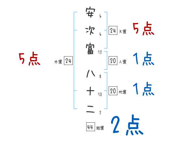 天運![]() | 安次富八十二さんの天運は24画の5つ星!家庭運が良く順調な人生。金運にも恵まれる。 家系が持つ宿命的な運勢を表します。祖先から受け継いだ苗字ですので自分の力が及びません。家柄を象徴します。 |