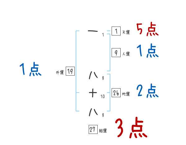 天運![]() | 一八十八さんの天運は1画の5つ星!行動力、指導力があり出世し繁栄する。幸運に恵まれる。 家系が持つ宿命的な運勢を表します。祖先から受け継いだ苗字ですので自分の力が及びません。家柄を象徴します。 |