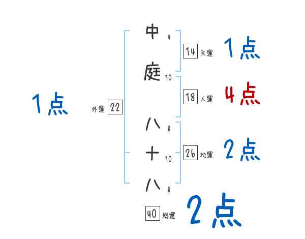人運![]() | 中庭八十八さんの人運は18画の4つ星!情熱的で剛気。忍耐力があり信頼される。 性格や才能などを表す2番目に重要な運勢です。人間関係や協調性、社会的な成功に影響します。主に20歳から50歳ぐらいまでの中年期の運勢を表します。 |