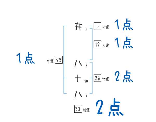 天運![]() | 井八十八さんの天運は4画の1つ星!感情が不安定で苦労するかも。周囲との協調を心掛けましょう。 家系が持つ宿命的な運勢を表します。祖先から受け継いだ苗字ですので自分の力が及びません。家柄を象徴します。 |