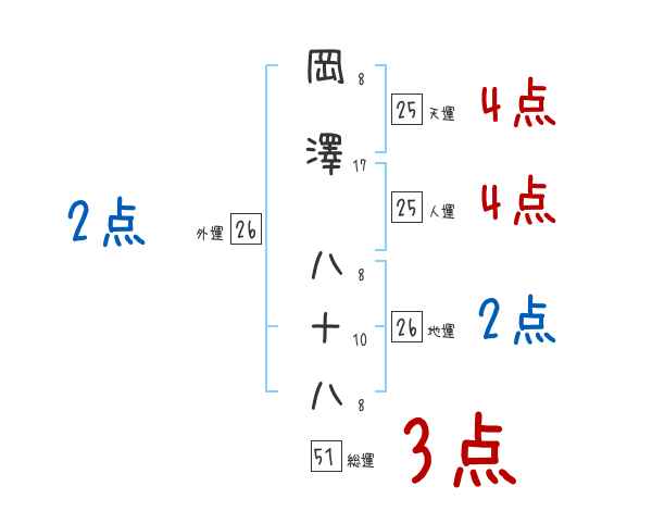 外運![]() | 岡澤八十八さんの外運は26画の2つ星!波瀾万丈かも。信頼できる人を大事にしましょう。 生活面を象徴する運勢です。外部から受ける影響力を表し、結婚運、家庭運や職場、環境への順応性を表します。 |