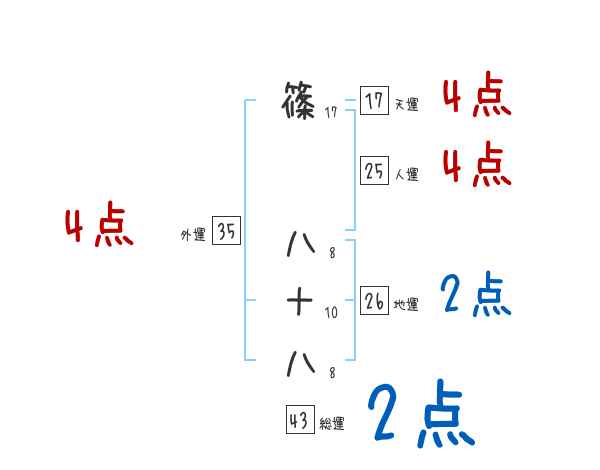 天運![]() | 篠八十八さんの天運は17画の4つ星!積極的な行動力。地位を気づき財産を手に入れる。純粋な心と直感力。 家系が持つ宿命的な運勢を表します。祖先から受け継いだ苗字ですので自分の力が及びません。家柄を象徴します。 |