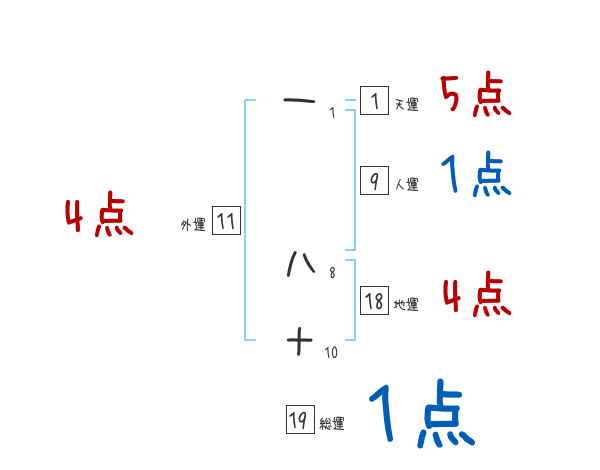 天運![]() | 一八十さんの天運は1画の5つ星!行動力、指導力があり出世し繁栄する。幸運に恵まれる。 家系が持つ宿命的な運勢を表します。祖先から受け継いだ苗字ですので自分の力が及びません。家柄を象徴します。 |